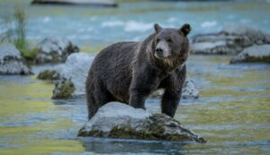Brown grizzly bear hunting salmons in the creek